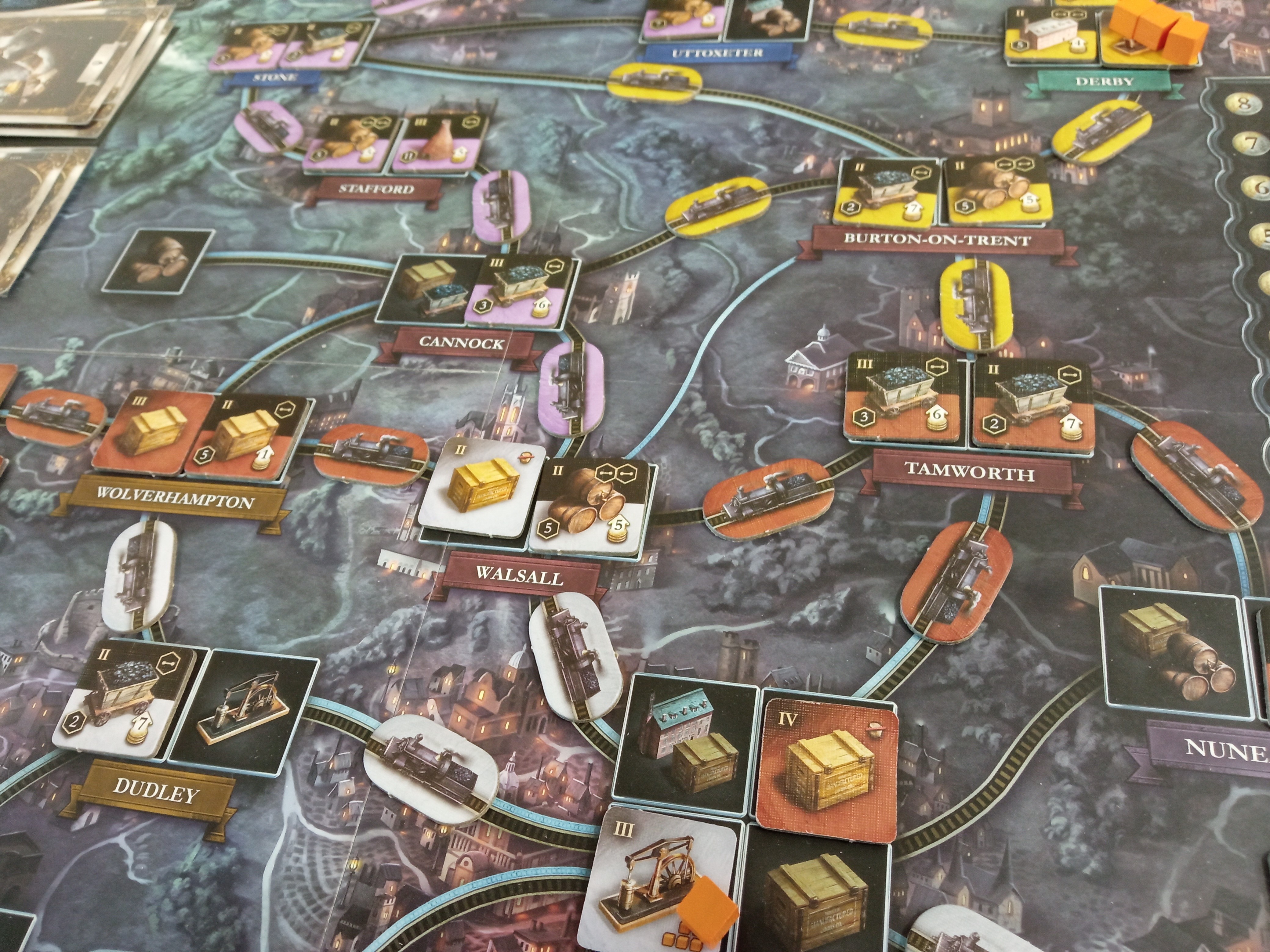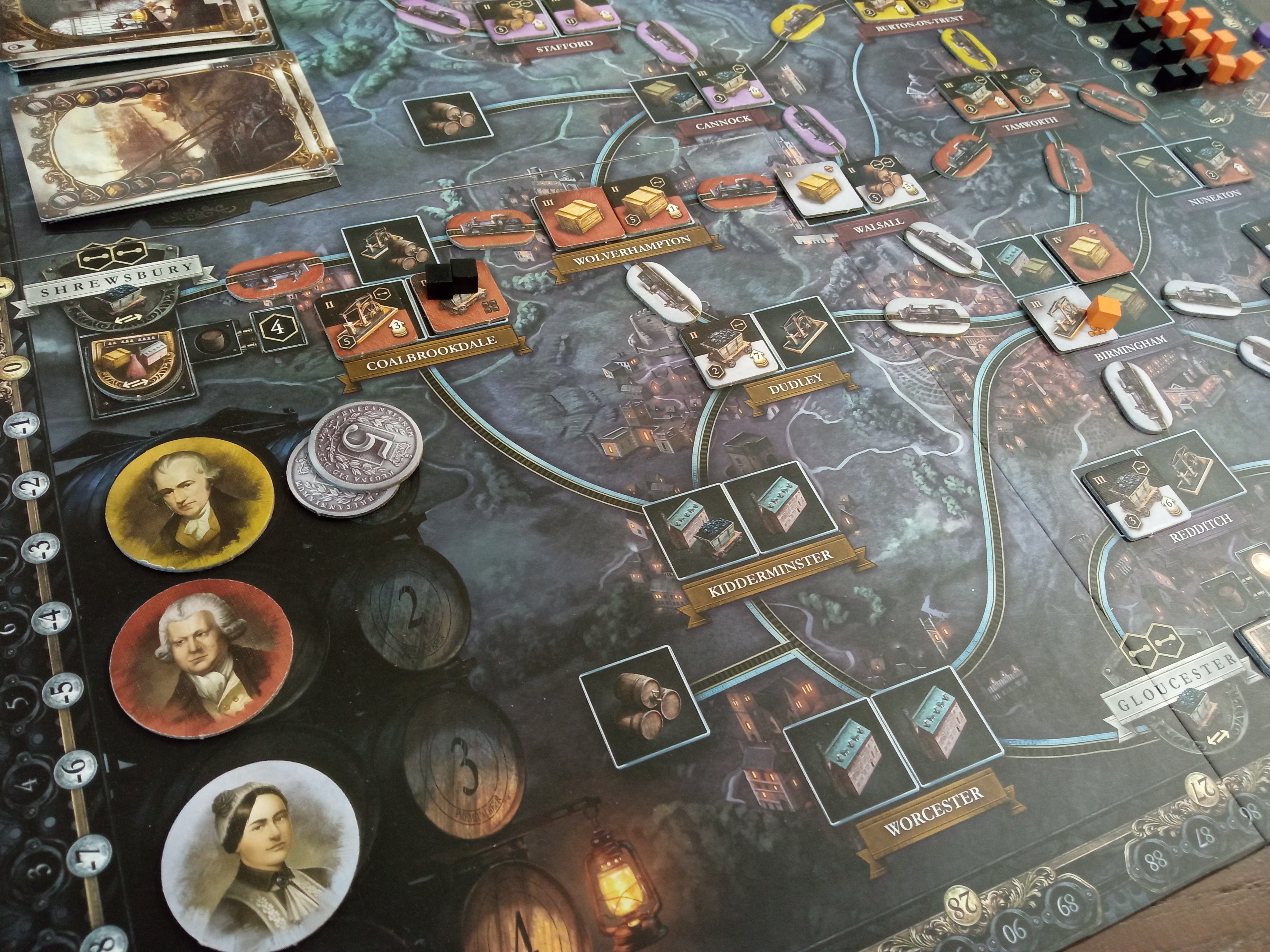 Ale co to povídám, očko se přimhuřovat nemusí, protože až na tyto drobnosti se Brass: Birmigham dá popsat jedním slovem: DOKONALOST. Začneme u samotného vizuálu hry, který je více než nádherný. Krásná bílá krabice, ze které na vás dýchne sychravé počasí Anglie a úplně z něho cítíte tu špínu průmyslu. Dále tu máme hrací plán s denní a noční dobou s moc hezky zpracovanou mapou. Dle barvy si vyberete za jakou historickou osobnost budete hrát a něco si o ní můžete přečíst. Je toho dost a to jsme ještě nezačali hrát. Tolik interakce mezi hráči v eurohře se běžně nezažije a než se dostanete na řadu (kdy se vůbec nebudete nudit čekáním), pravděpodobně počínání vašich protihráčů způsobí, že budete muset udělat něco naprosto jiného, než jste chtěli. Ale neznamená to, že by Vám hned někdo musel škodit. Tím se dostávám ke geniálně vyřešenému systému sdílených surovin. Pokud si chcete postavit nějaký průmysl, který potřebuje např. uhlí, prostě si ho vezmete z nejbližšího dolu. Je úplně jedno, čí důl je, jeho majitel se na vás hned zlobit nebude, protože v případě vytěžení dolu, on dostane přírůstek na příjmu peněz a vítězné body. V případě chybějících surovin, si je můžete koupit na trhu, kde se se zvyšující se poptávkou, zvyšuje i cena za surovinu (což je více než nad slunce jasné a logické). Zde je i v pravidlech vysvětlený důvod, proč musí být uhlí propojeno se stavbou a proč železo nemusí (odpověď ve zjednodušené formě je v podtitulu recenze). Téma hry na vás prostě dýchá každou akcí a vy si připadáte jako ten vystresovaný továrník. Každá éra se navíc sama uzavře tím, že vám prostě dojdou karty, spočítáte body a je hotovo!