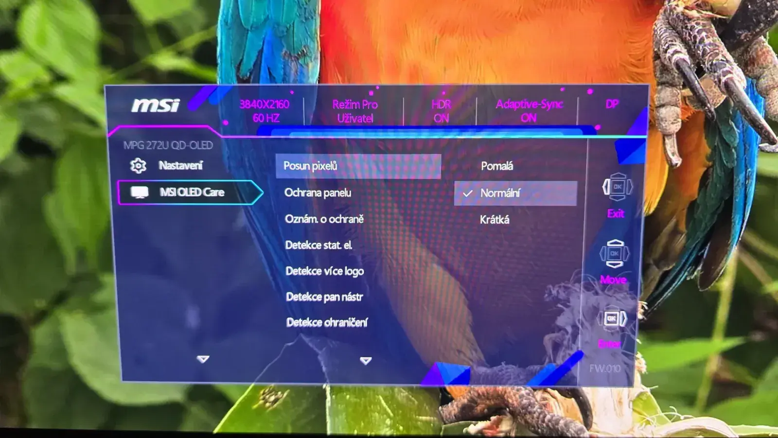 Jedna z nejdůležitějších částí menu. MSI nabízí kompletní sadu nástrojů, které chrání panel před vypalováním: Pixel Shift, Pixel Refresh, Static Screen Detection a další.
