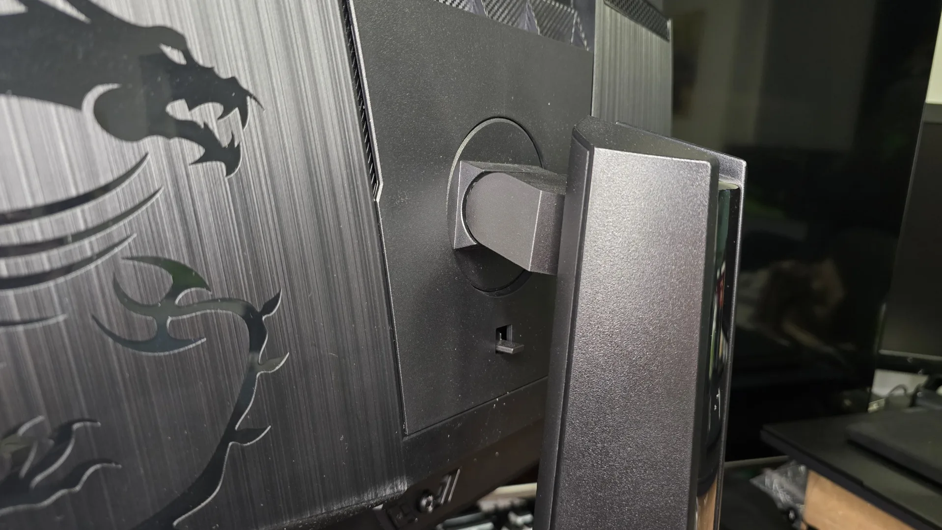 Zadní strana kombinuje matné plasty s jemnou texturou a decentním ambientním podsvícením Mystic Light, které působí elegantně, aniž by rušilo, tedy žádné přehnané světelné efekty. Nenajdete tu ani žádné plastové výstřelky – jen čistý, funkční design s průduchy pro co nejlepší chlazení panelu. Je vidět, že MSI se snažilo vytvořit monitor, který nebude působit levně, ale zároveň nebude přehnaně okázalý.