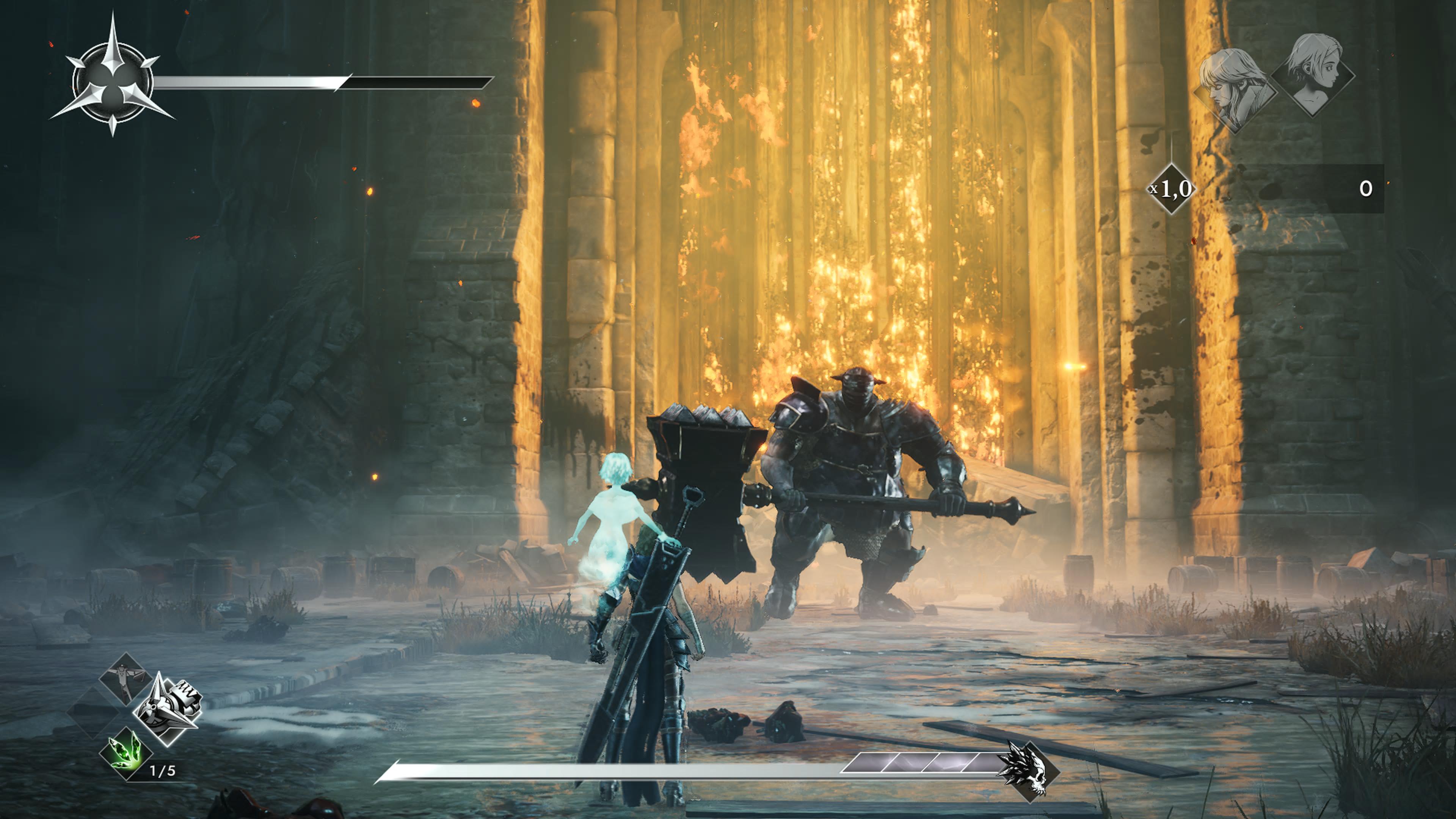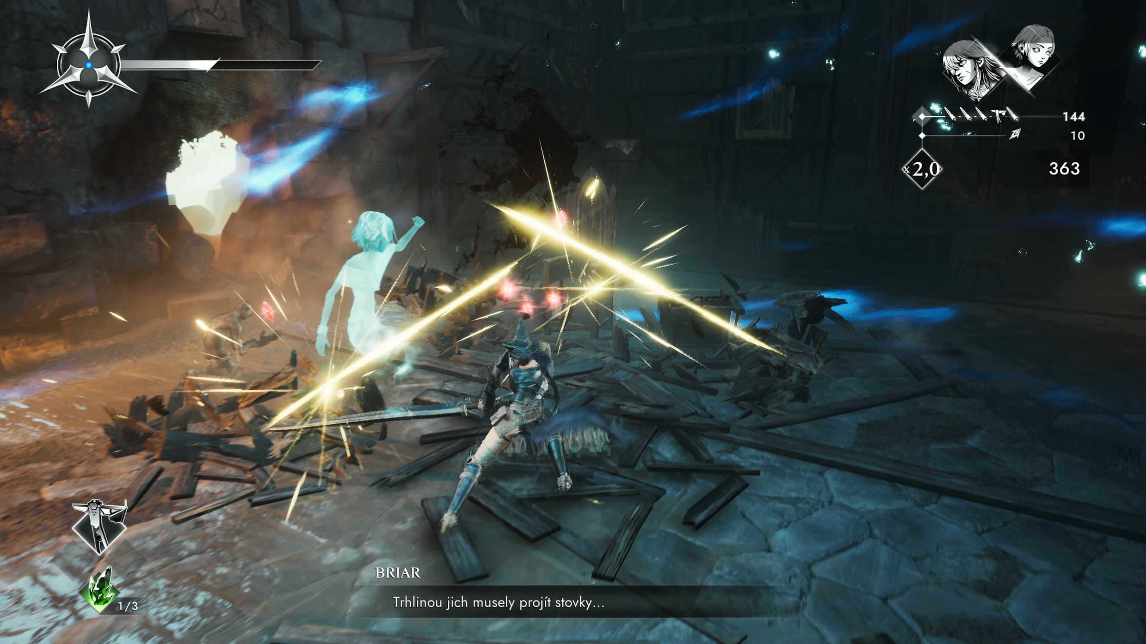 Což o to, mohlo jít o staromilský prvek, ale úhly snímání v Soulstice jsou občas až šílené. Hrdinky Briar s Lute mnohdy sledujete z velké dálky a jindy s nimi musíte utíkat přímo směrem k obrazovce. Dá se na to zvyknout, ale pocit frustrace se i tak čas od času dostaví, zejména ve skákacích pasážích či v méně přehledných soubojích. Přičiněním drakonického režiséra tak hra sice někdy nabízí působivé výhledy na bezútěšné město a okolí, to však na úkor hráče samotného. V době psaní recenze Soulstice dokončilo pouze cca pět procent hráčů (na libovolnou obtížnost), vsadil bych se, že mnohé znechutila právě problematická kemera.